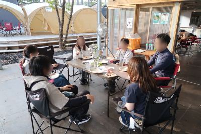 ジンギスカンを食べてお腹いっぱいになった後は、1対1の自己紹介タイムです。あまりにも風が気持ち良いので、そとのテラスに椅子を並べ、お互いプロ フィールカードを交換しながら1対1で自己紹介を進めていきます。前半のパークゴルフやジンギスカンを食べたこともあって、とても和やかなムードの中で自 己紹介タイムが進んでいきました。