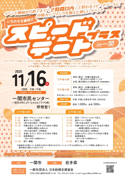 2025.11.16 いちのせき縁結び スピードデートプラスin一関(午前・午後の部) を開催します