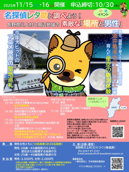 2025.11.15-16 長野県川上村婚活イベント 名探偵レタ助と調べよう! を開催します