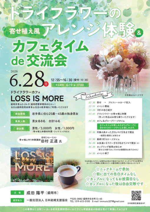 ~コミュニケーションスキルを上げてから婚活パーティーに出てみよう~コミュニケーションスキルアップセミナー(男性編・女性編)&フラワーアレンジメント&交流会<コミュニケーションスキルアップセミナー(男性編)>◇1回目(基礎編) 平成29年6月18日 16:00~18:00◇2回目(応用編) 平成29年7月2日 16:00~18:00参加費:それぞれ資料代 500円会場:矢幅駅前 矢巾町活動交流センター「やはぱーく」3階 会議室参加資格:25~45歳の独身男性 10名程度 ※2回続けての受講をオススメします ※イベントへの参加はセミナー受講者を優先します~セミナー内容~・婚活を始めるなら何から始めればいい?・「察しない男・説明しない女」婚活・ビジネスに役立つ異性とのコミュニケーションの取り方・婚活パーティー、こうすれば会話は続く!・女子ウケする婚活ファッションについて・婚活パーティー必勝法・パーティーでカップルになった後はどうすればいい? など<コミュニケーションスキルアップセミナー(女性編)>◇1回目(基礎編) 平成29年6月18日 13:00~15:00◇2回目(応用編) 平成29年7月2日 13:00~15:00参加費:それぞれ資料代 500円会場:矢幅駅前 矢巾町活動交流センター「やはぱーく」3階 会議室参加資格:25~45歳の独身男性 10名程度 ※2回続けての受講をオススメします ※イベントへの参加はセミナー受講者を優先します ~セミナー内容~・婚活を始めるなら何から始めればいい?・普通の人でいいのに・・・普通の男が何故みつからない?・「察しない男・説明しない女」婚活・ビジネスに役立つ異性とのコミュニケーションの取り方・男子のハートをつかむ婚活ファッションについて・婚活パーティーでこれだけはやってはいけない!女子ならではのNG行動・パーティーでカップルになった後はどうすればいい?<フラワーアレンジメント&交流会>開催日 平成29年8月6日 13:30~17:30(13:00受付)参加費 1、000円(フラワーアレンジメント材料費含む)会場:矢幅駅前 矢巾町活動交流センター 「やはぱーく」 3階 研修室参加資格:25~45歳の独身男女 各10名程度 ※イベントへの参加はセミナー受講者を優先します ※申込み多数の場合は抽選等行います◆イベント内容◆フラワーアレンジメント体験自己紹介タイムフリータイムカップリング※※カップリングは専用の用紙に連絡先の交換を希望したい方の番号と名前を頂戴して、事務局でカップリングします。カップリングの結果は、個別にメモでお渡しして、カップルになった方には会場に残っていただき、本人同士で連絡先の交換をしていただきます。主催/GOOD・BE(グッドビー)〒020-0011 盛岡市三ッ割字鉢の皮68-38電 話 090-3365-2404(担当:武田) E-mail:goodbe.mt@gmail.comこの事業は(公財)いきいき岩手支援財団のいわて子ども希望基金の助成を受けて実施しております<申込先・名簿管理・運営協力> 一般社団法人 日本結婚支援協会申込みフォーム ← クリックお申し込みは直接持参、または郵送、FAX・Eメールでお願いします 日本結婚支援協会 盛岡市住吉町13-40 FAX019-613-5101 Eメール taguchi@supreme-kekkon.jp《参加確定通知・・・メールにて連絡》 各イベント・セミナーの3日前■参加規約■ (申込み前に必ずお読みください)[参加資格] 開催日時点において、男女とも満25歳以上45歳以下の独身者で、居住地制限はありません。 (初婚・再婚は問いません)[参加除外] 申込者が以下の項目のいずれかに該当する場合は、当イベントに参加できません。 1.暴力団員、または反社会的組織の構成員、若しくはこれに類する者と判断された場合 2.既に交際中の相手がいる、または結婚している場合 3.参加申込書の記載漏れ、虚偽の記載があった場合 4.参加費用を支払わなかった場合[個人情報の取扱い] 参加者の個人情報の取扱いについては、以下のとおりにします。 1.参加申込書に記載された個人情報について、管理保管は日本結婚支援協会が行います。 2.参加者同士の個人情報の公開または交換等は、参加者本人の責任により行うこととします。イベントでカップルになった後、交際するかどうかなどの判断も、本人同士にゆだねられます。また、カップルにならなかったお相手の連絡先お教えすることはできません。 3.お預かりした個人をもとに、主催者または日本結婚支援協会、ならびにその関係団体から、イベントなどのご案内メールを差し上げる場合があります。 (メルマガ等登録も含む)[禁止事項] 参加者の以下の行為を禁止します。 1.参加者のプライバシーを侵害し、名誉を傷つける行為。また交際を断られた相手に、直接間接に関係なく連絡を取る行為 2.営利、宗教活動等を目的とした行為 3.イベントの進行を妨げる行為 4.本規約に違反する行為 5.法令に違反する行為[損害賠償] 本規約の違反および違法な行為によって当事業に損害を与えた場合、当所は参加者に対し損害賠償を請求することがあります。[免責事] 当イベント終了後の男女の交際、事故、およびトラブル等について、主催者ならびに日本結婚支援協会は、一切の責任を負わないものとします。また交際後